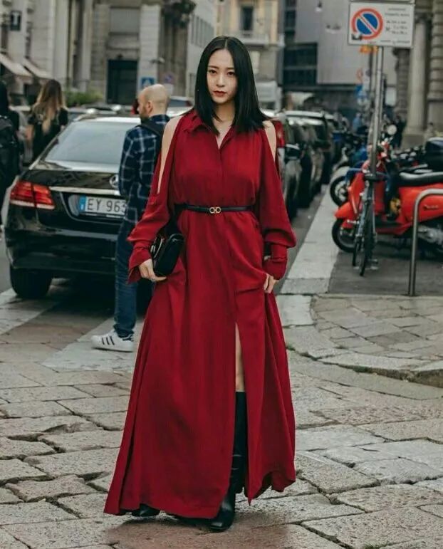 大紅色的襯衫長裙看著比較的有特色了,紅色比較的襯皮膚搭配了一雙黑色的靴子,看起來就會顯得比較的大氣了。