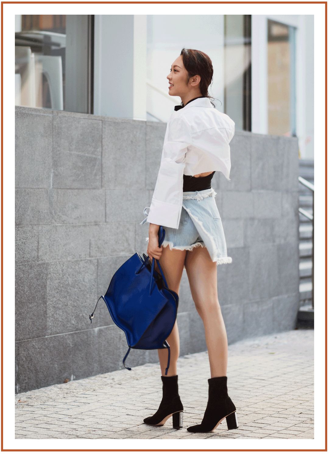 我這一身牛仔裙褲和白襯衫的搭配,非常清爽、幹練。腳跟閃閃發光的碎鑽絕對是亮點,這樣的穿搭也非常適合日常上班了。