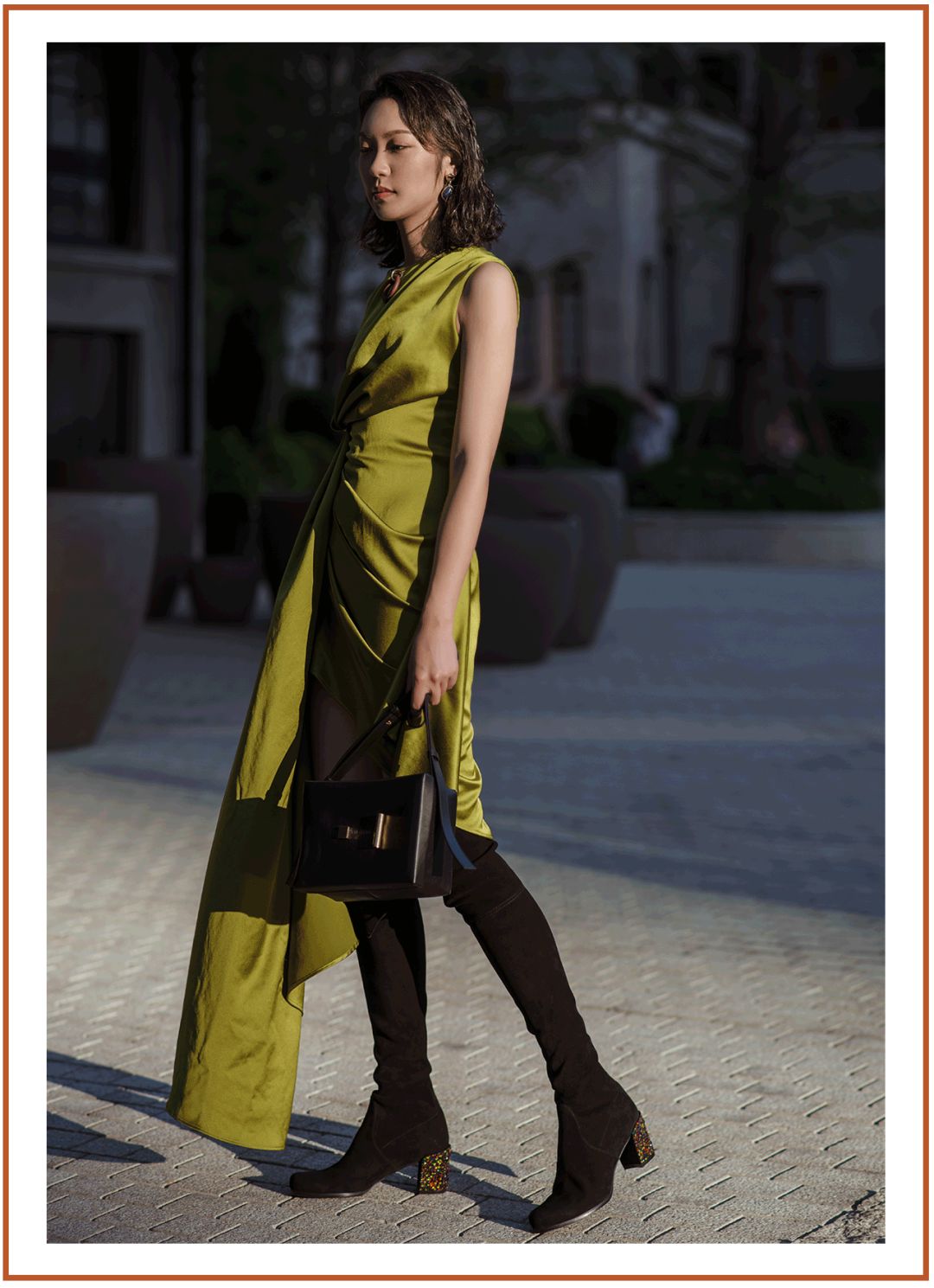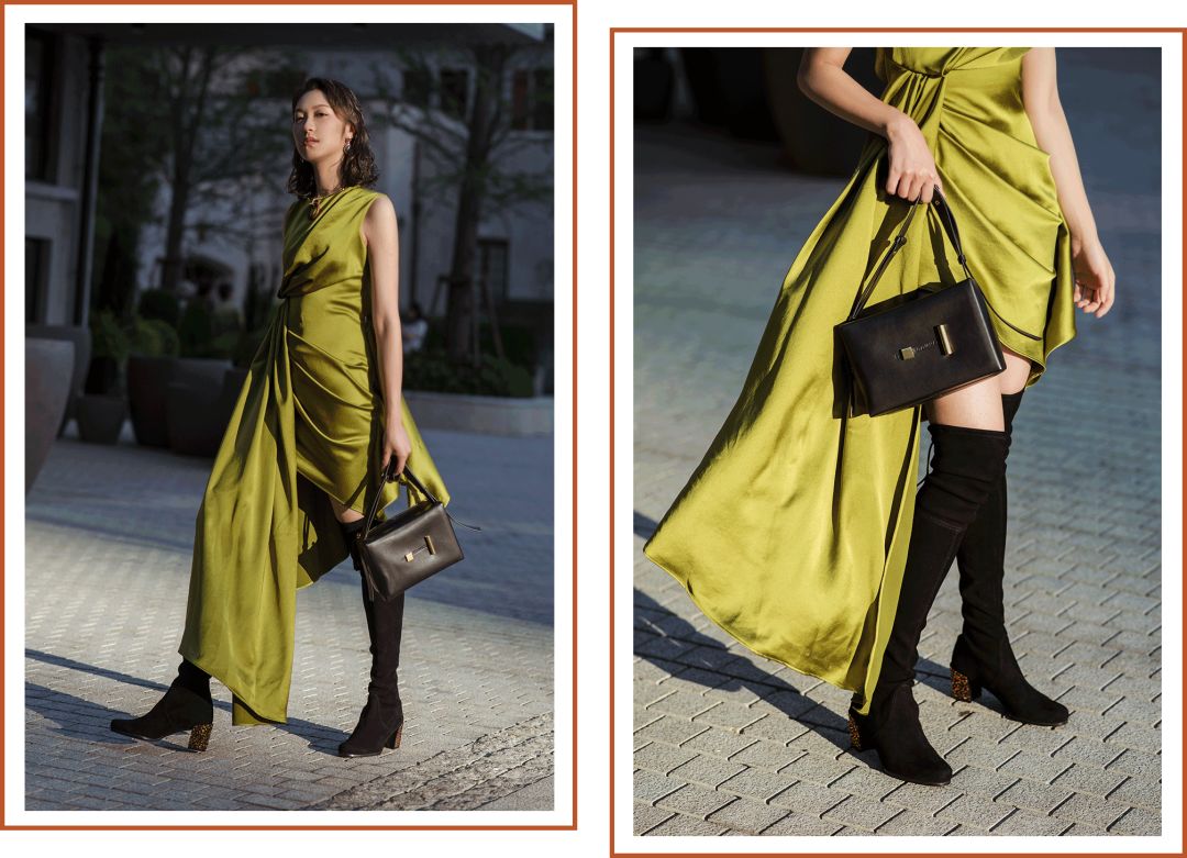 我選了一條OFF-WHITE的裙子來搭,橄欖綠的絲綢裙在腰間做了獨特的打結設計,不對稱裙擺配上這款長靴剛剛好,隱約露出雙腿,有種若隱若現的小性感~