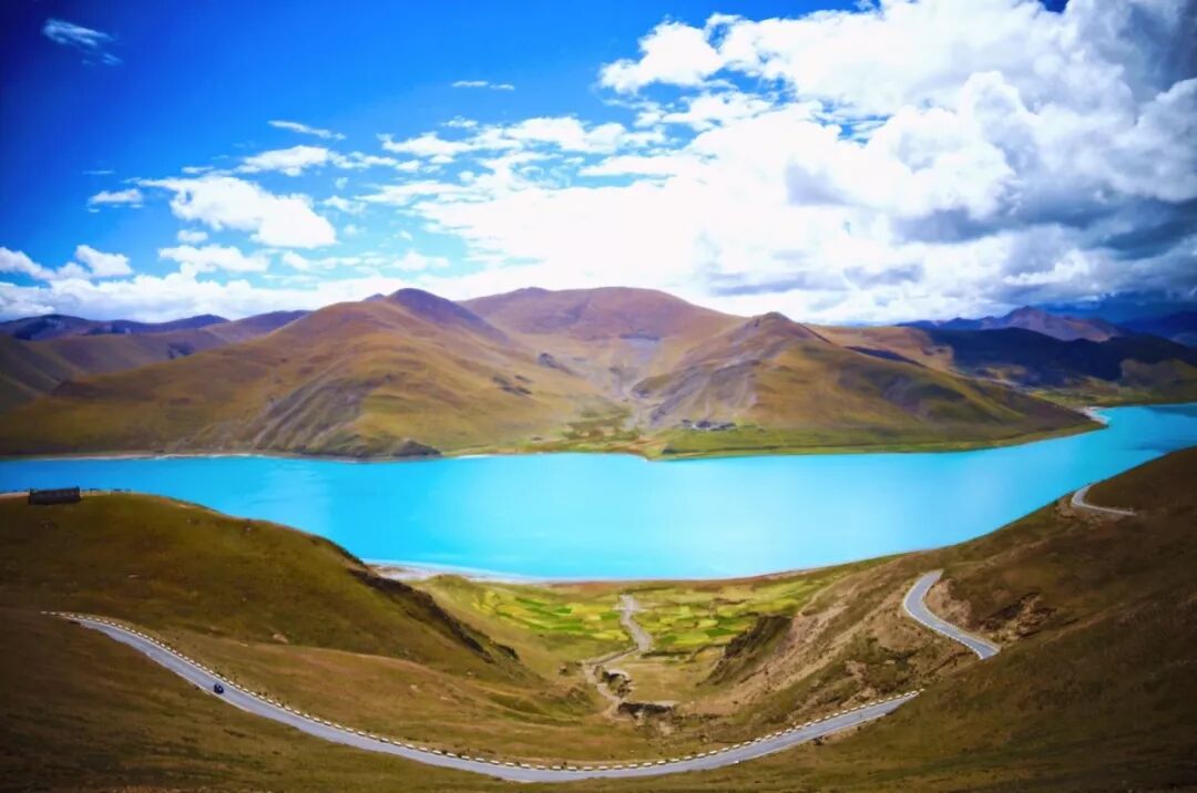羊卓雍措,藏語意為「碧玉湖」,也被人們簡稱為羊湖。這里的風景果然沒有辜負這個美名。寶藍色的湖水,折射出不同的層次,波光粼粼。
