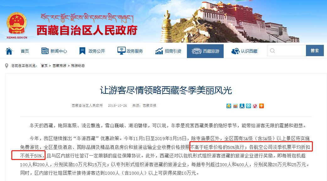 西藏3A級及以上景區、三星級以上酒店統統半價、進藏航班不低於50%
