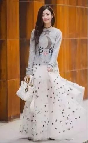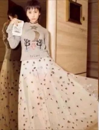趙麗穎穿的這條裙子給人的印象就是非常的溫柔和清新。她上身穿的,這件灰色底的毛線衣,上面印著星星和月亮。