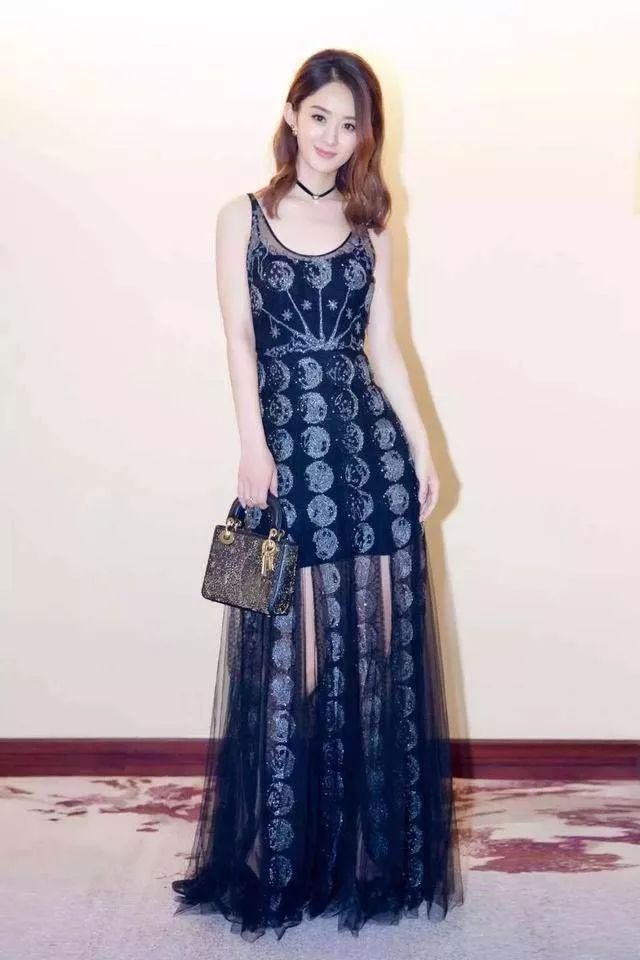 趙麗穎出席活動時的這條藍色的薄紗長裙就很特別,非常優雅大方了。這條藍色的裙子上面印著月圓月缺的花紋,設計的非常獨到。