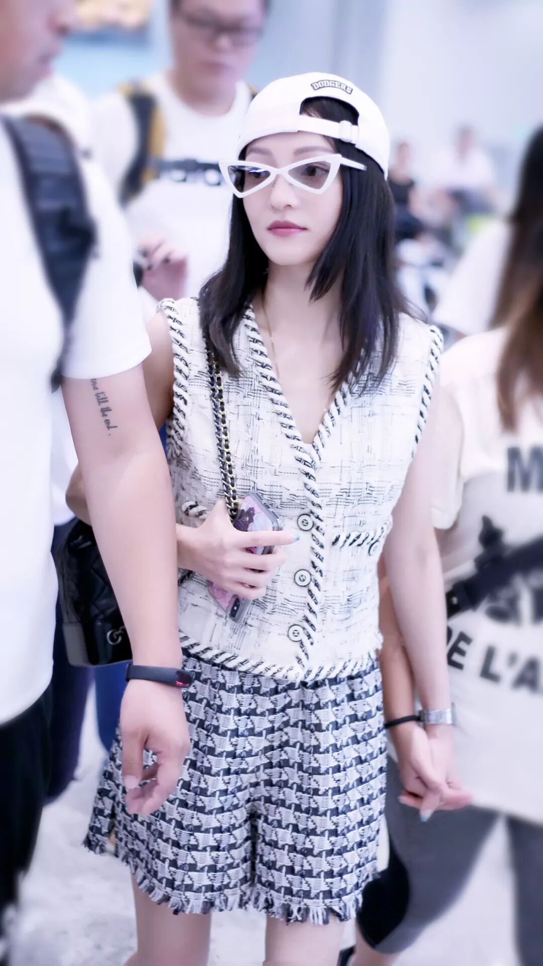 張韶涵已經很瘦了,居然還要穿一身黑,看著就更加瘦了,這短外套里面穿了件短上衣,看著腰更細了。