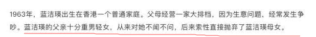 有人說她這樣的性格源於童年的經歷,藍潔瑛的父親非常重男輕女,對她不聞不問,後來更是拋棄了她們母女。