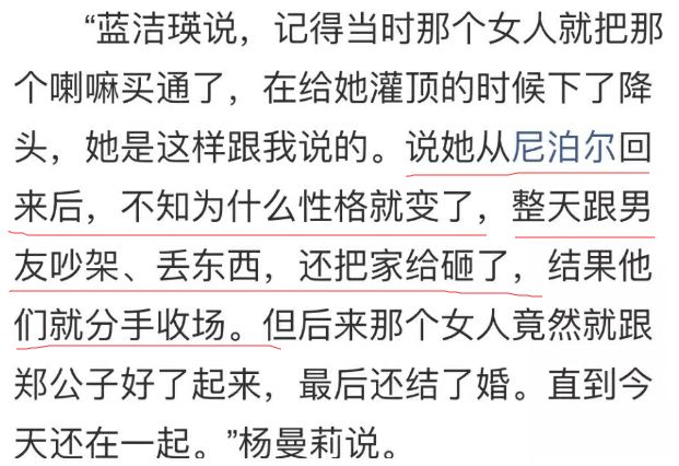 96年開始,她和香港鄭姓富商的小兒子鄭家業交往了。可是後來卻有消息說,她旅行時帶了閨蜜,然後被「下降頭」,男朋友也被搶走了。