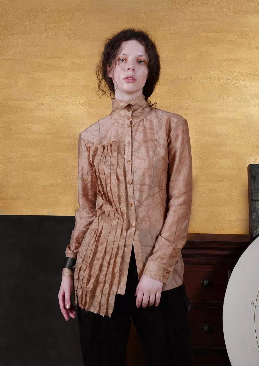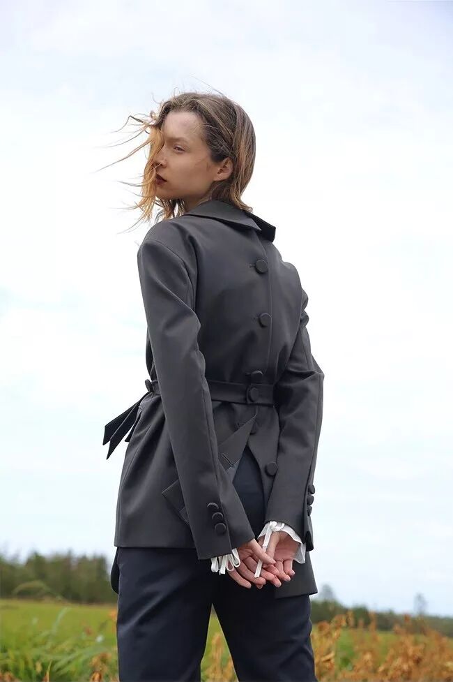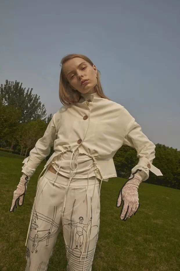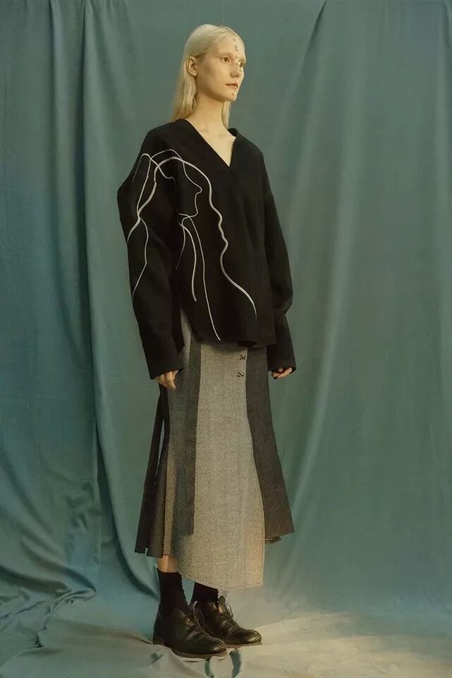 俗集雖然衣服主色調是黑白灰,款式風格卻意外的微甜——體現在一些宮廷風褶皺處理、小部分的拼接花邊配色等設計點。每個系列都是以小故事為線索呈現,照設計師張曉敏的話來說:像高原上的放牧少女,暖色調電影里面的浪漫女主角。