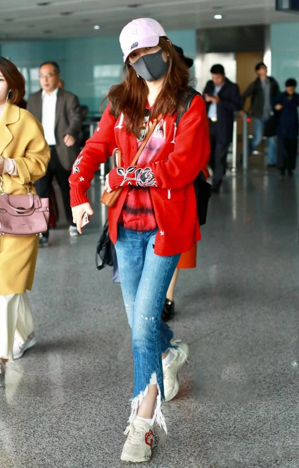 爛大街的牛仔褲,趙薇也可以穿出時髦感覺,這條牛仔褲,讓自己美腿得到凸顯,看起來更加苗條,同時搭配的紅色上衣,格外博眼球。