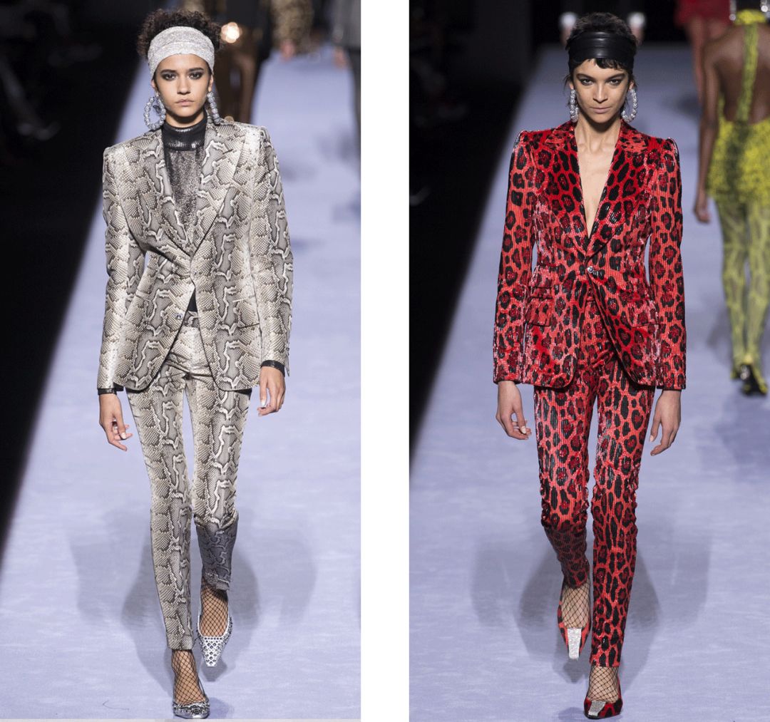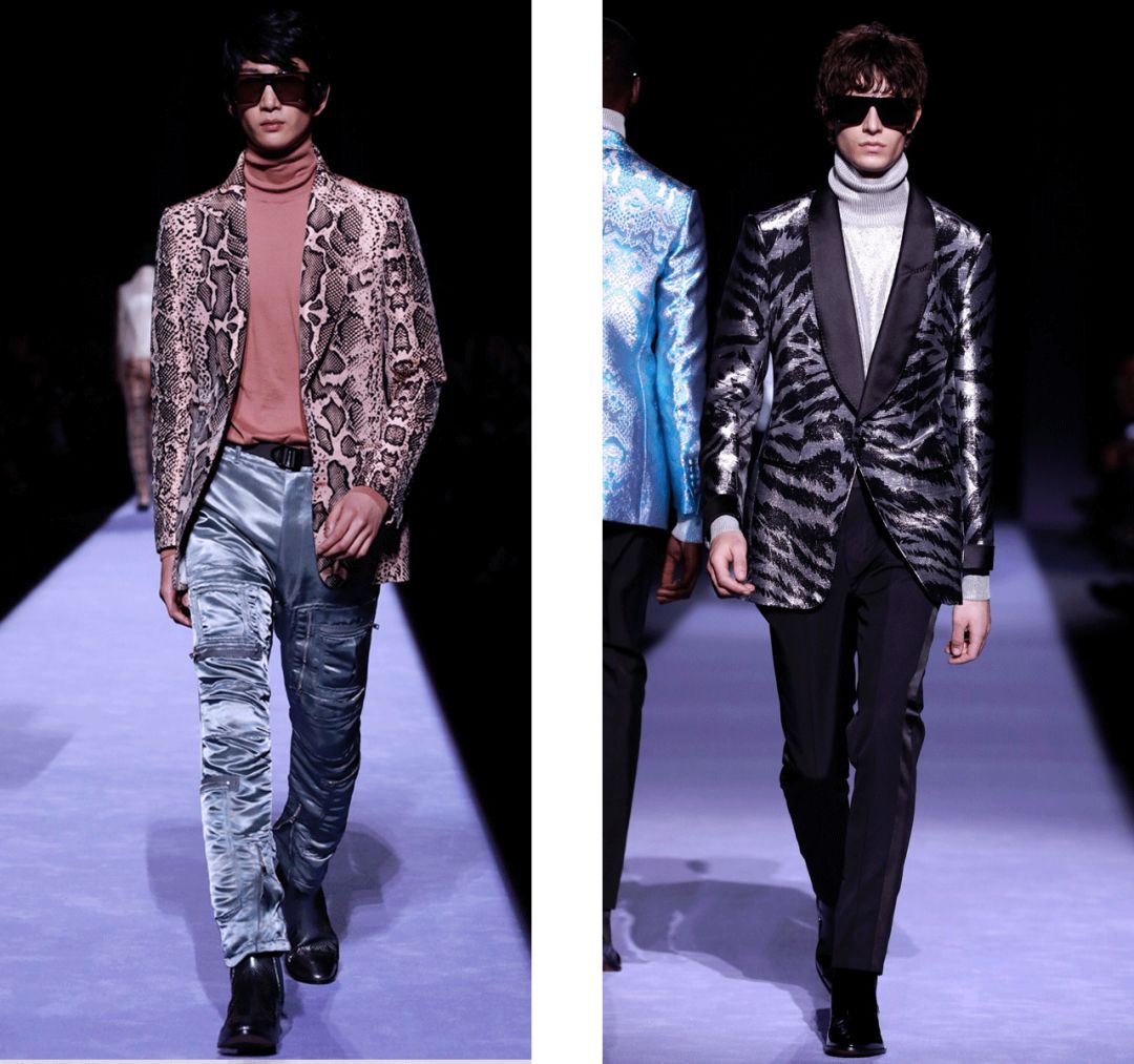 男裝呢,和女裝的元素呼應,純色高領、動物紋西裝,特別搶眼。性別的流動性讓TOM FORD的時裝更神秘。