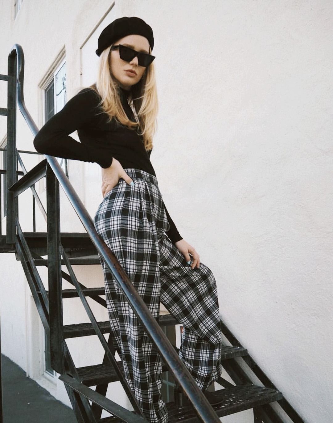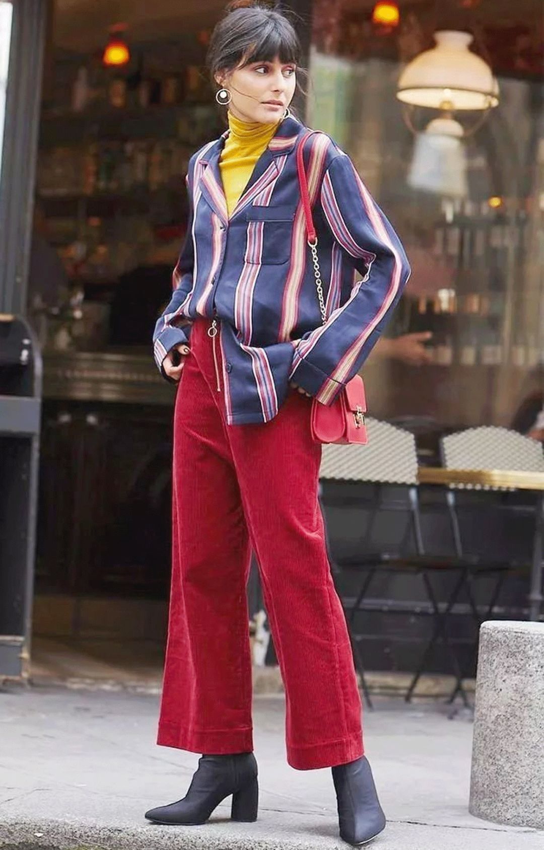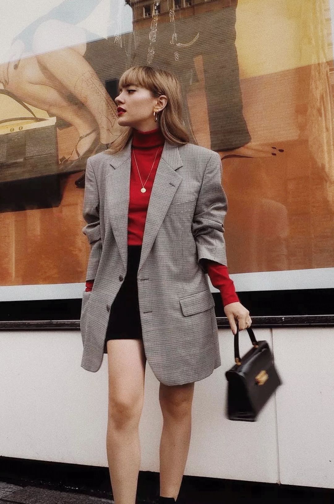 如果是比較花里胡哨的花條紋,最好穿簡單點。格紋、印花、動物紋的秋衣也一樣,都適合搭配乾淨的外套。換上帥氣的西裝,時髦度和洋氣值手拉著手往上走。