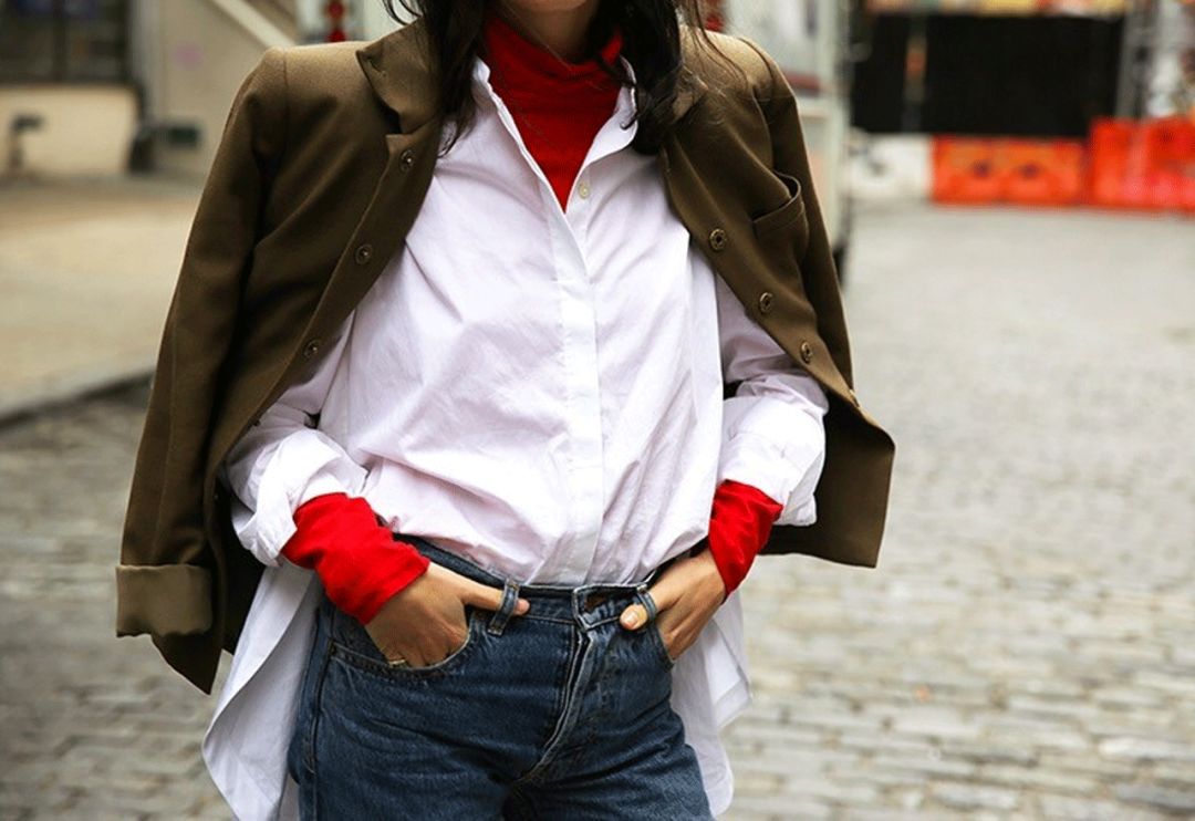高領秋衣比起圓領、V領內搭,更特別適合和襯衫組CP,解開幾顆扣,留出個三角開口。視覺看上去瘦5斤,還顯臉小。