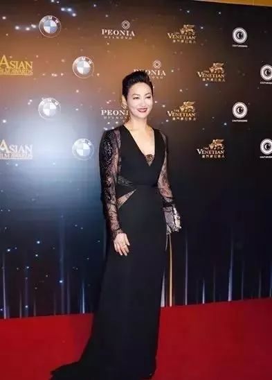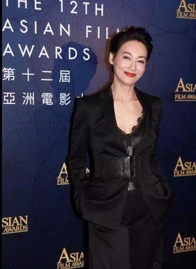 惠英紅這樣穿就顯得非常的酷,她的上身穿了一件黑色的西裝,再用非常寬的黑腰帶收腰,露出蕾絲邊內搭,很性感呀。