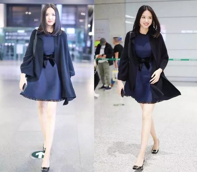 藍色連衣裙外搭藍色針織開衫外套,大高個也能穿出甜美風。這大長腿也是讓大家羨慕得不要不要的。