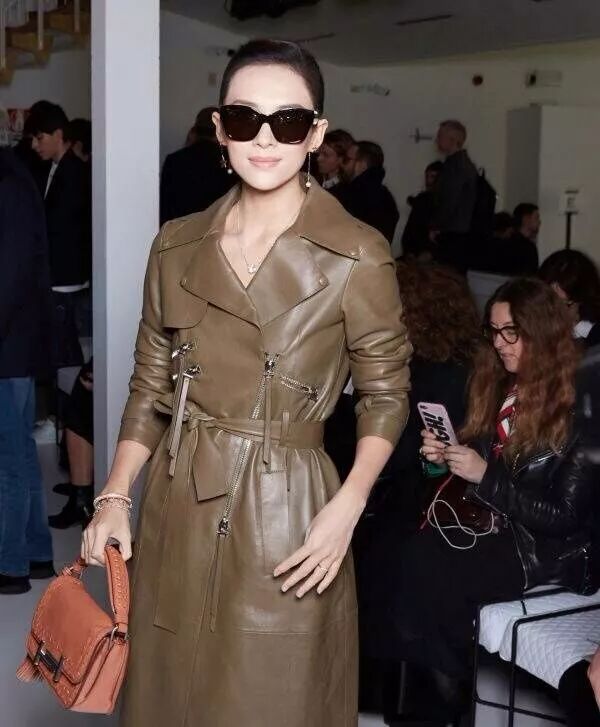 再看最後一身她穿的是一條卡其色的皮革大衣裙,這種顏色比較顯老,領口是敞開式的設計,露出了她優美的天鵝頸和性感的鎖骨,穿在她身上感覺就是不一樣。