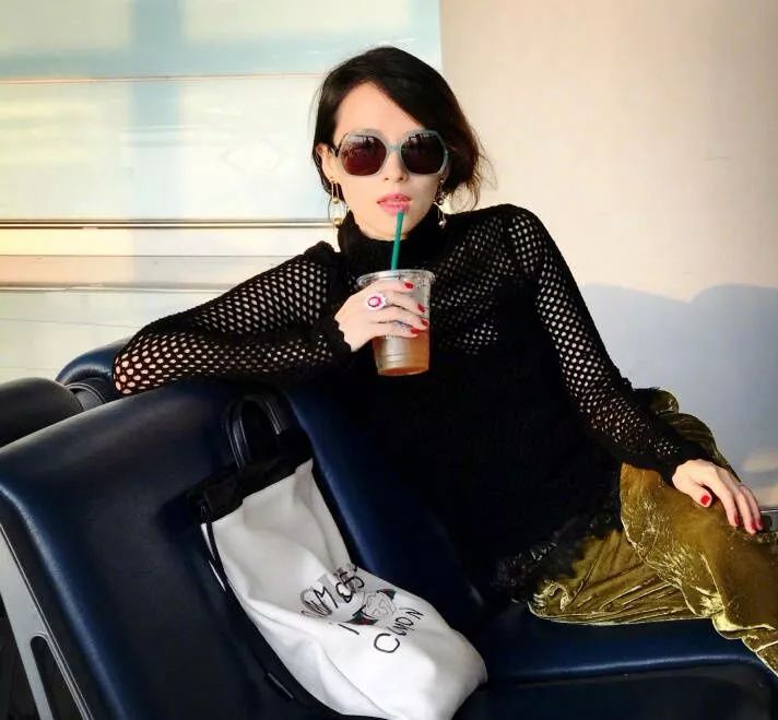 章子怡這身造型就比較成熟了,她穿了一件黑色的長袖上衣,並且袖子是網洞鏤空的設計,看起來比較性感,而且她穿了一條金色的褲子,看起來特別顯眼。