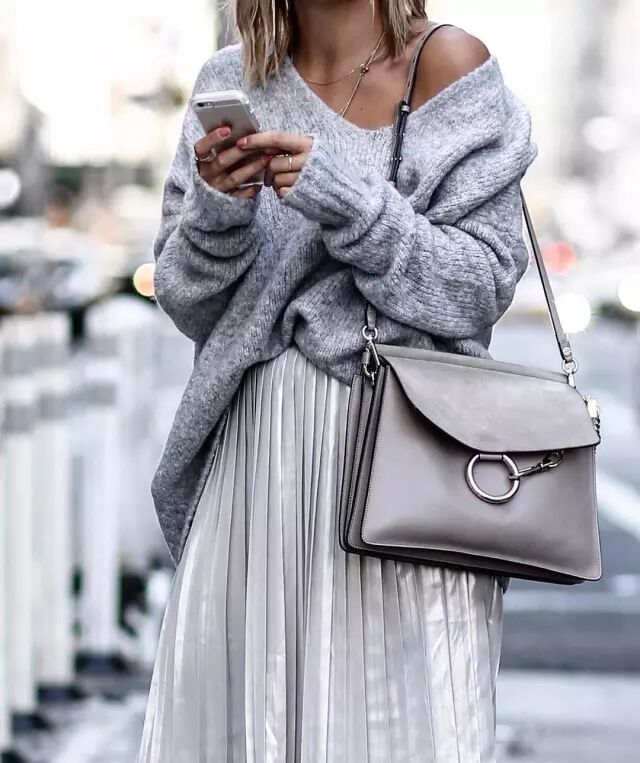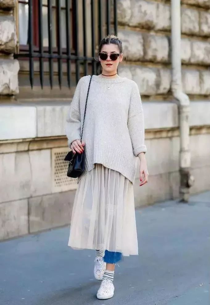 或者是灰色毛衣搭一條百褶裙,將性冷淡風進行到底!