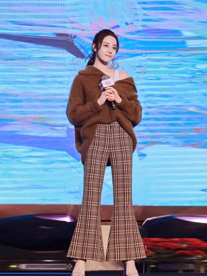 熱巴則是一條格子喇叭褲+露肩寬鬆毛衣,這也只能是凹造型的時候用,保暖可用不著這樣!