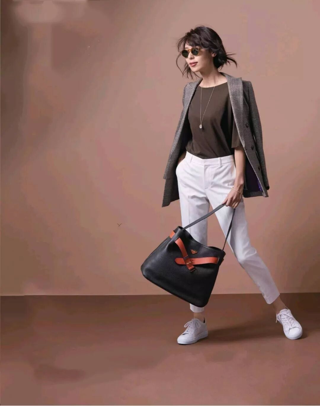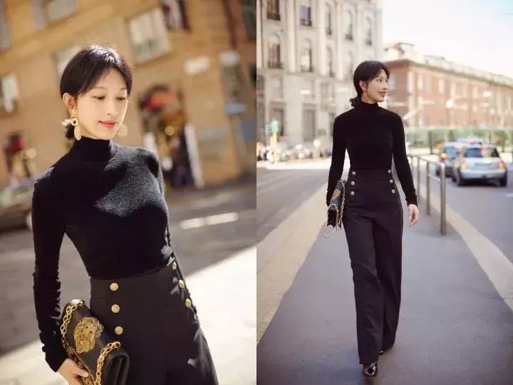 白月光「容音」在拍攝雜誌的時候,穿的是同色的高腰闊腿褲,棕色給人溫和,袖口一點白襯的設計,從視覺上讓手看起來更纖長!