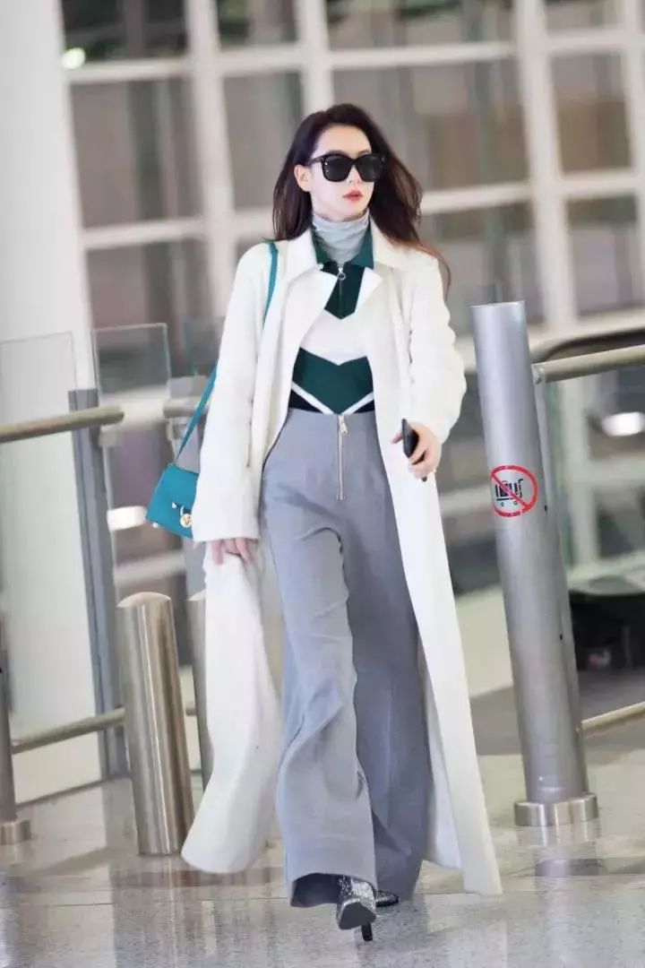 戚薇內搭的毛衣是比較艷一點的綠色,但是在白色風衣的掩蓋下,總體來說風格還是偏冷淡,高腰褲+毛衣簡直是絕配的內搭!