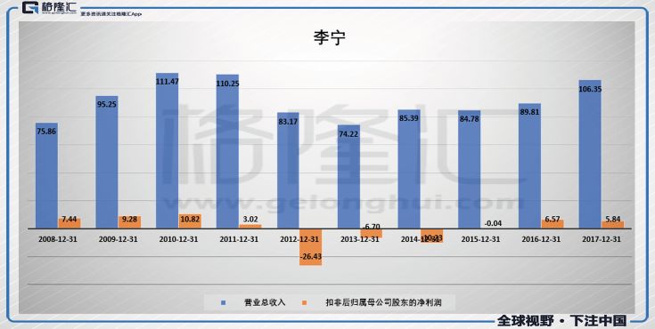 而2018年上半年的表現,李寧業績有復蘇,營收同比增18%至47.13億,但是對比於安踏44%的增速,105.53億的營收,還是較為遜色。回顧上面兩個數據圖,其實早在2012年的時候李寧就把中國體育品牌大哥的位置讓給了安踏。