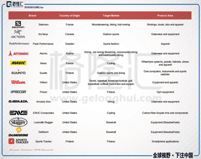 而安踏,旗下除了有FILA之外,還有Spradi、Descente、Kolon Sport和Kingkow,FILA早已成為安踏營收的主力軍。與此同時,安踏最近計劃收購芬蘭體育用品公司Amer Sports,要是收購成功的話,安踏會擁有下面這些品牌矩陣。