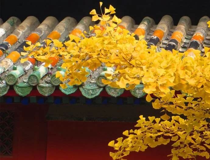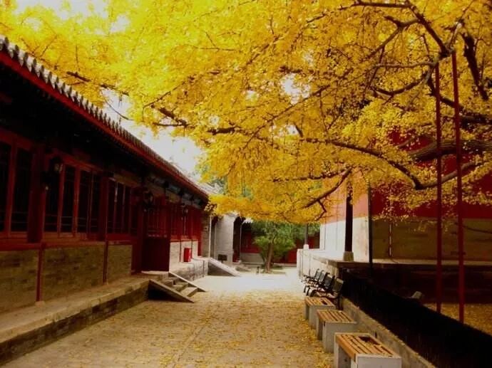 愛作詩的乾隆爺也沒放過這棵銀杏,驚嘆於這樹的粗壯,驚嘆之餘還感慨萬千賦詩道:「世外滄桑閱如幻。」滿樹千年的金黃和古寺的紅牆綠瓦相互映襯,站在這棵樹下,才能真切感受到故都秋天的古味深沉。