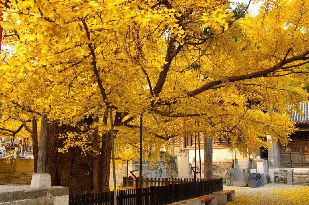 大覺寺坐落北京西山,是一座千年古剎,無量壽殿前就有兩顆雌雄銀杏樹。雄樹也已經是一棵上了年紀的千年古樹。近千年的生長,獨木成林,濃蔭遮蓋了大半個院子,仿佛在秋天撐開了一把金色巨傘。