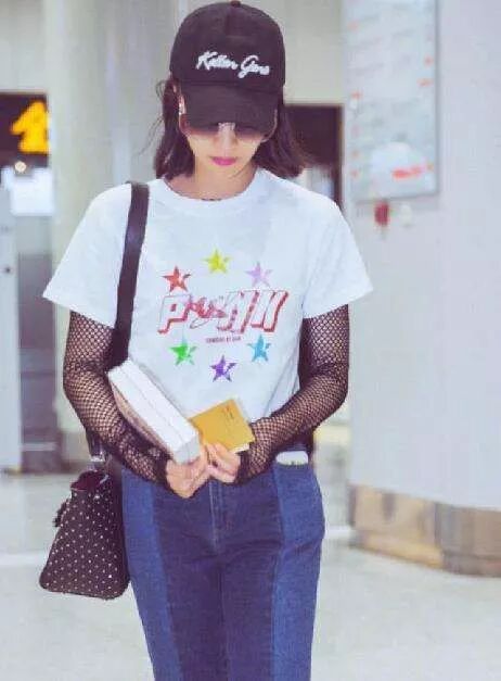 雖說今年很流行漁網元素,但是穿上胳膊也是頭一次見呢。白色T恤清新十足,和拼色牛仔褲搭配也算是最佳cp,只是這漁網看的人尷尬症都犯了。