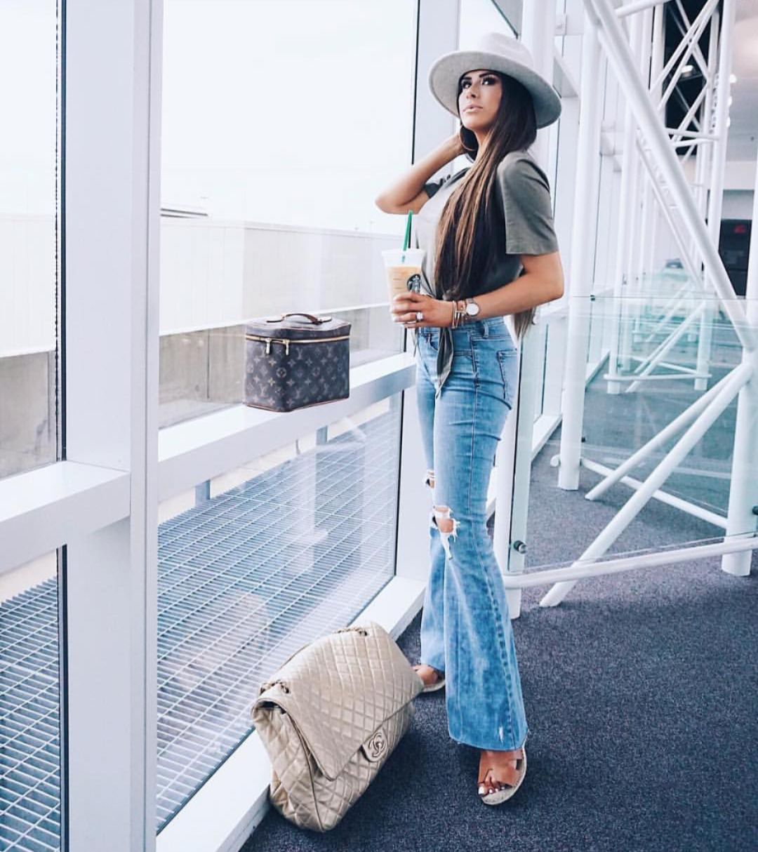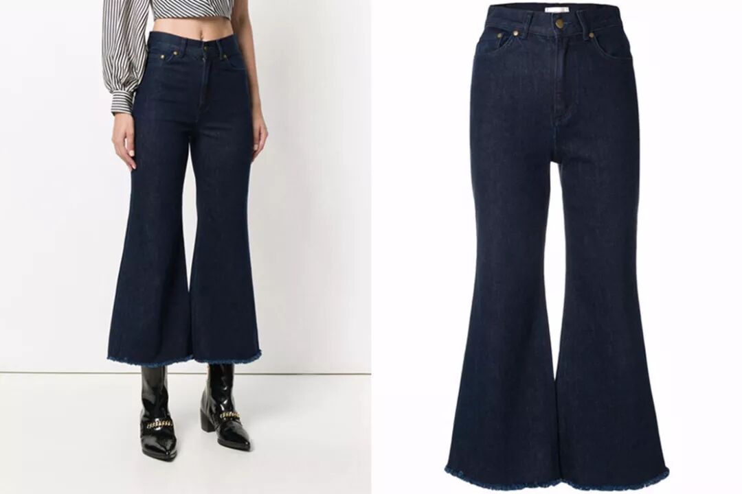 曳地褲在春末夏初時和闊腿褲結合在一起格外流行,然而模特博主明星們搭配高跟鞋一個個穿出瘋狂的腿,正常人買到家里卻生生變成了麻袋。所以改良一下,讓曳地褲和牛仔喇叭褲合作一次,上部修身,下部分散開,復古時髦,風情萬種。