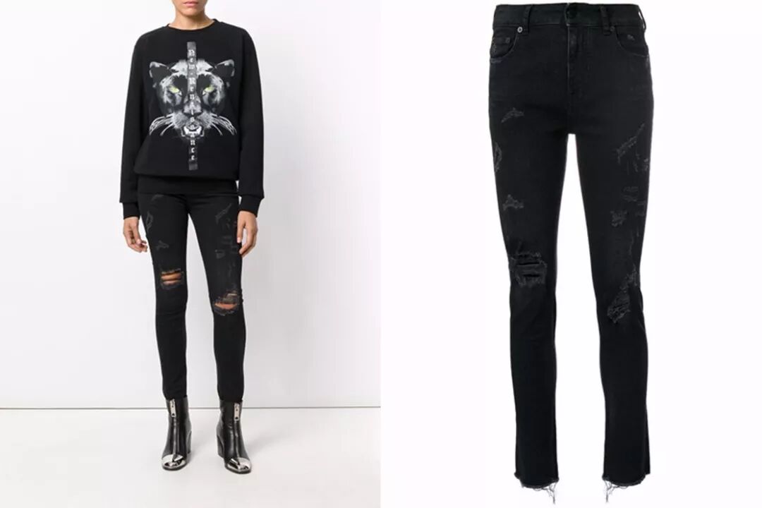 這類褲子比第一類稍微俏皮些,也很親民好穿。小腳褲大家都有,但在褲腳開個衩,效果也完全不一樣!開衩解放的是空間,即使你的腿部比例再好再修長,太緊身太包裹的褲子依然缺乏美感。然而結合了開衩設計後,前後偶爾翻起的兩片賦予了牛仔褲許多動感,走起路來更加chic時髦!