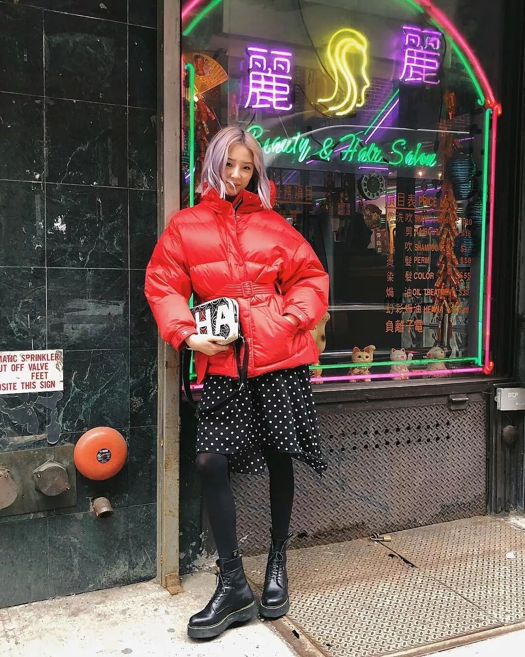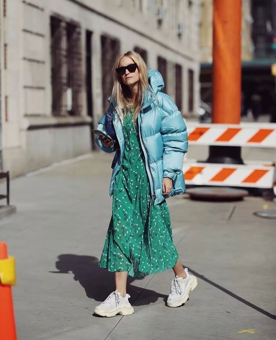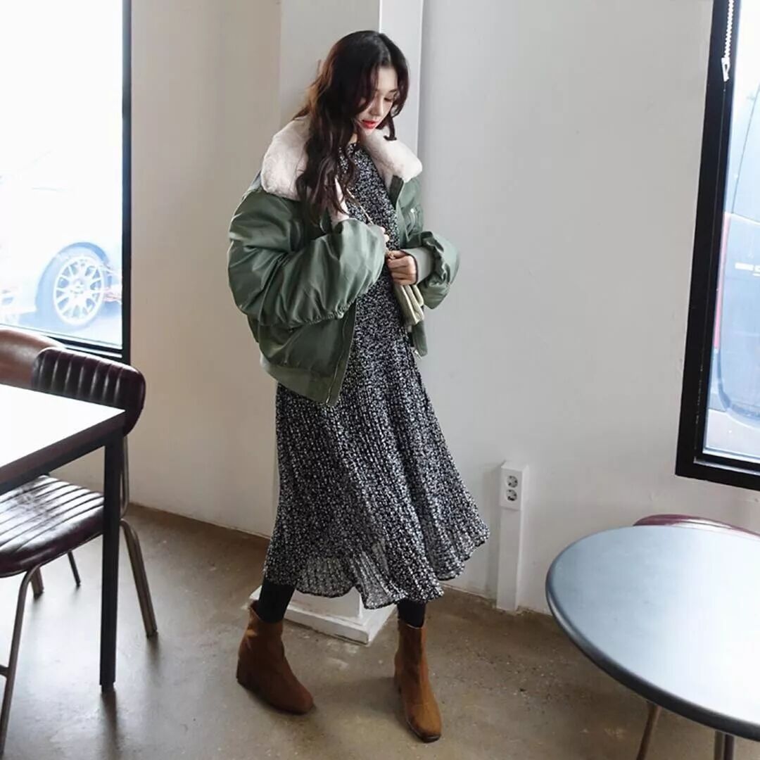 羽絨服+碎花裙,時髦有型,一雙老爹鞋,冬天也是酷帥娘man的時髦女孩!