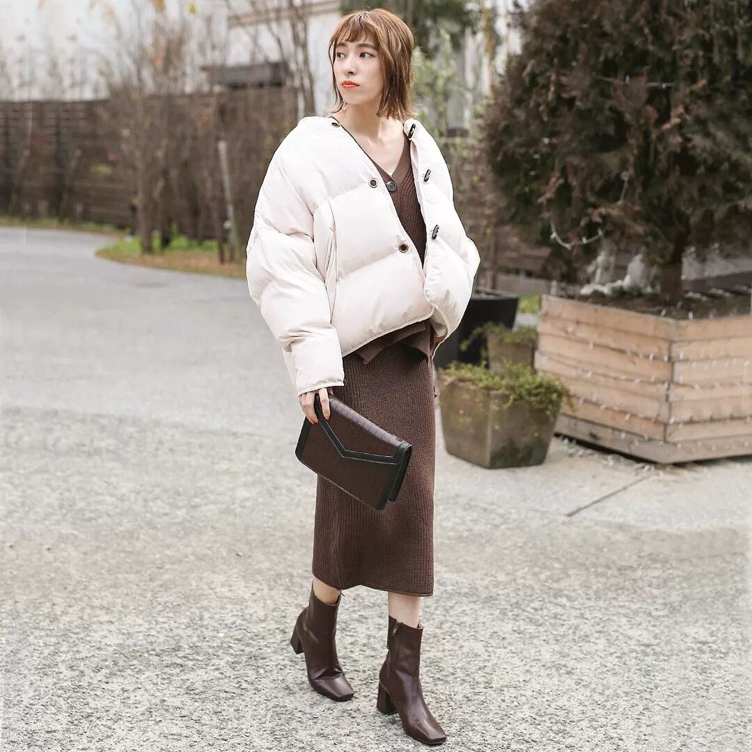 小腿粗,選擇羽絨服搭配長款裙子,長度在小腿肚和腳踝之間,搭配短靴穿搭就行。