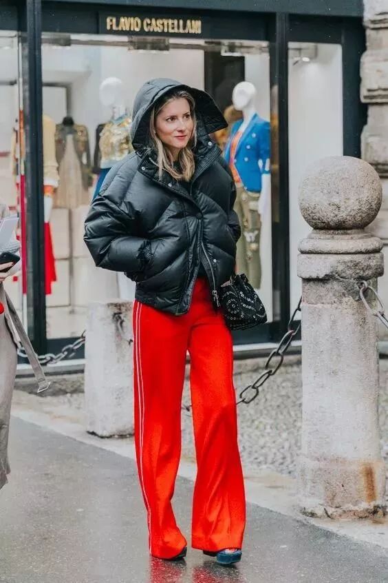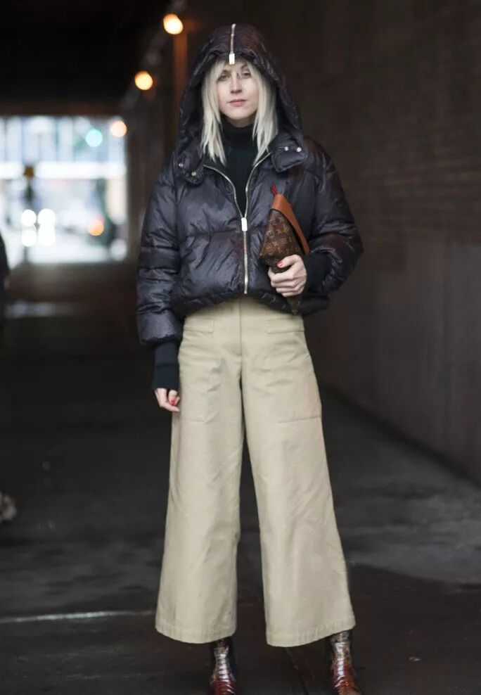 短款羽絨服,搭配高腰款闊腿褲,遮蓋腿粗還顯高。