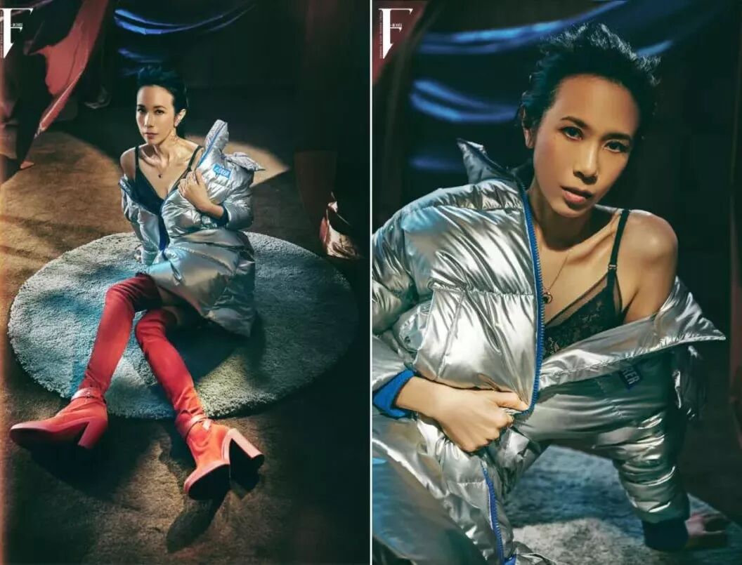 莫文蔚穿著銀色波司登羽絨服搭配紅色高筒靴,時髦未來感。