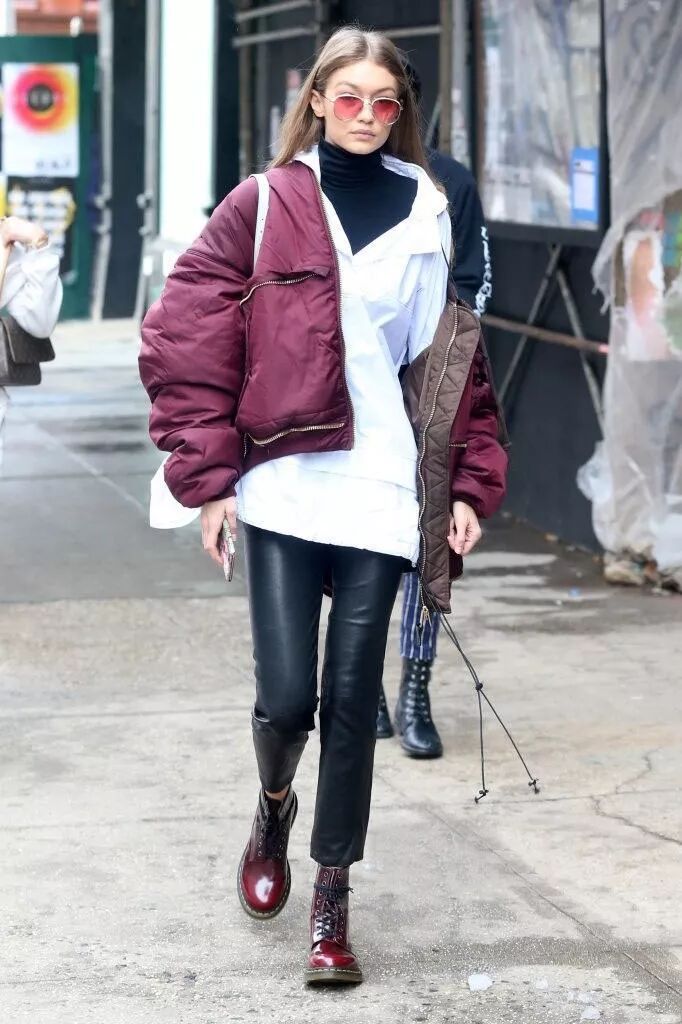 酷女孩還可以選擇羽絨服+皮褲,啞光的皮褲材質更低調日常。