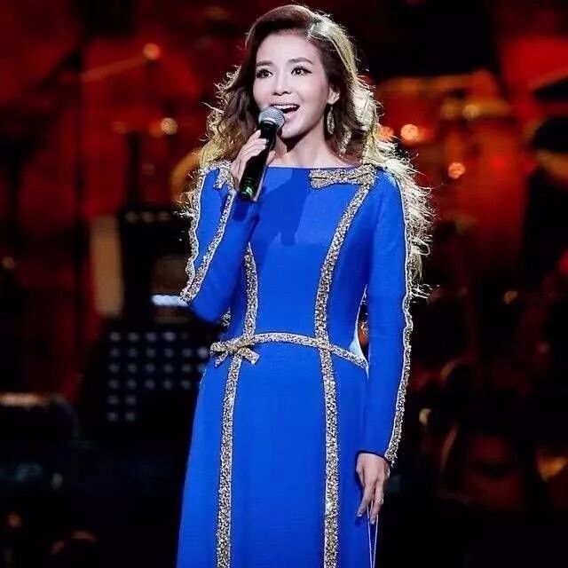 她這身晚禮服裙真耀眼,藍色和金色搭配在一起,一些金色小碎鑽用作邊沿裝飾,特別修身,看起來人比較瘦,就是藍色太過於深,看著比較壓抑。