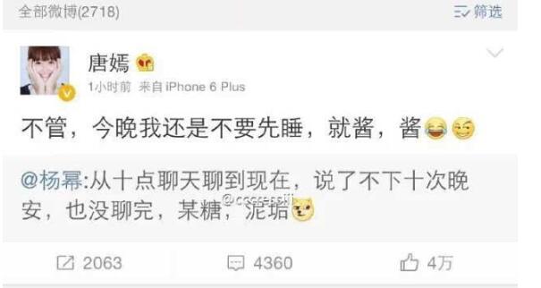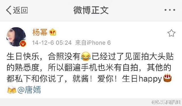 也有粉絲說,楊冪雖然「嘴硬」,但在細節處花了小心思。因為發微博時間卡著12:6,正好是唐嫣生日。