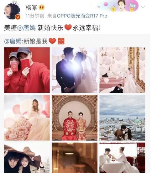 對比最新一次兩個人的微博互動。唐嫣結婚,楊冪轉PO,祝福詞……言簡意賅,官方得體。