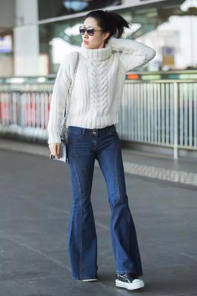 她還是比較喜歡穿牛仔喇叭褲的,搭一件純白色的高領毛衣,這樣的純色搭配顯高級,同時搭帆布鞋,充滿了青春活力感,紮馬尾純素顏,很清純感。