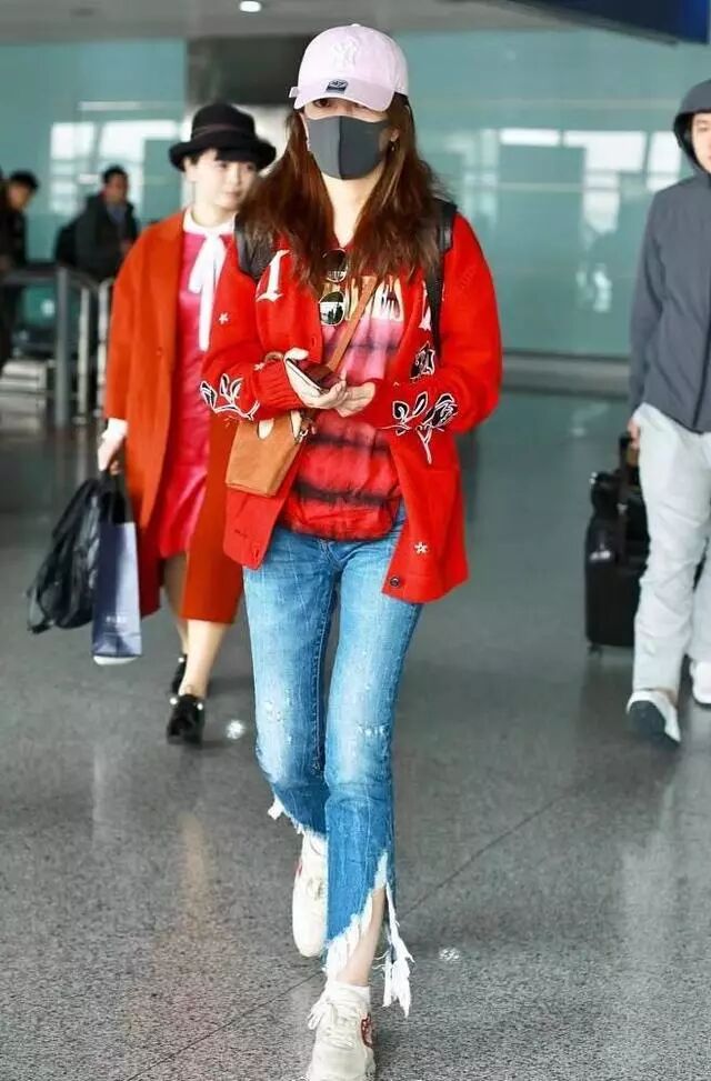 她的穿衣風格偏向於清新休閒架式了,緊身牛仔褲,搭配運動鞋,舒適又隨性,亮點就在上半身,大紅色夠吸睛了。