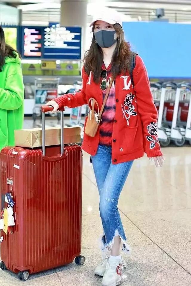 趙薇瘦下來了就是任性,在機場穿了一件紅色的T恤,搭大紅色的毛衣,整個人看起來氣色非常好,下面搭了一條緊身牛仔褲,時髦滿分。