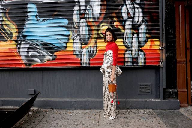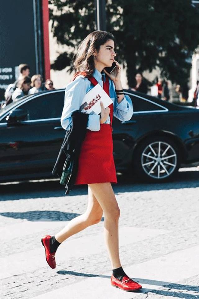 Leandra更多的是藍色系的LOOK,再加上紅色絲巾和鞋子的點綴,讓整體造型更加時髦。