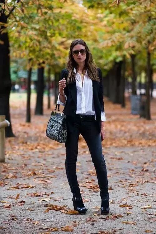 西裝外套+黑色打底襯衣+毛呢闊腿褲+小皮鞋,搭配一個圓圓的小黑包。若是敵不過寒冷的朋友就可以穿上稍厚的打底毛衣和毛呢褲子啦,里面還可以自行發揮添加衣服。