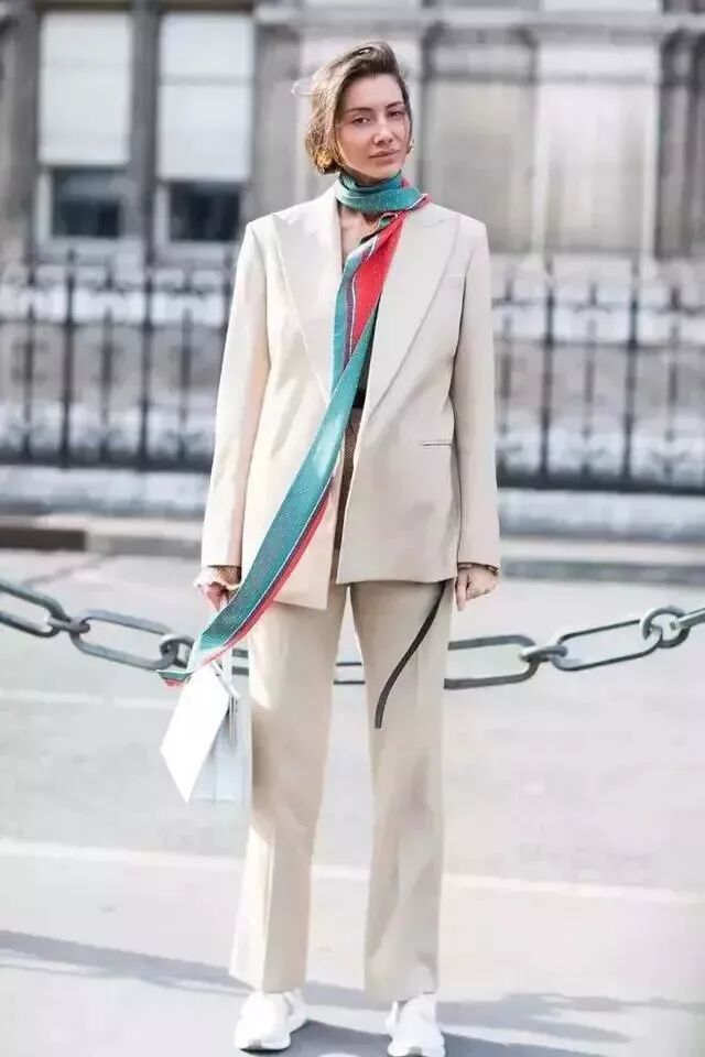 可以在上面穿搭的基礎上,在頸上、手上、或者腰間系一條印花絲巾。