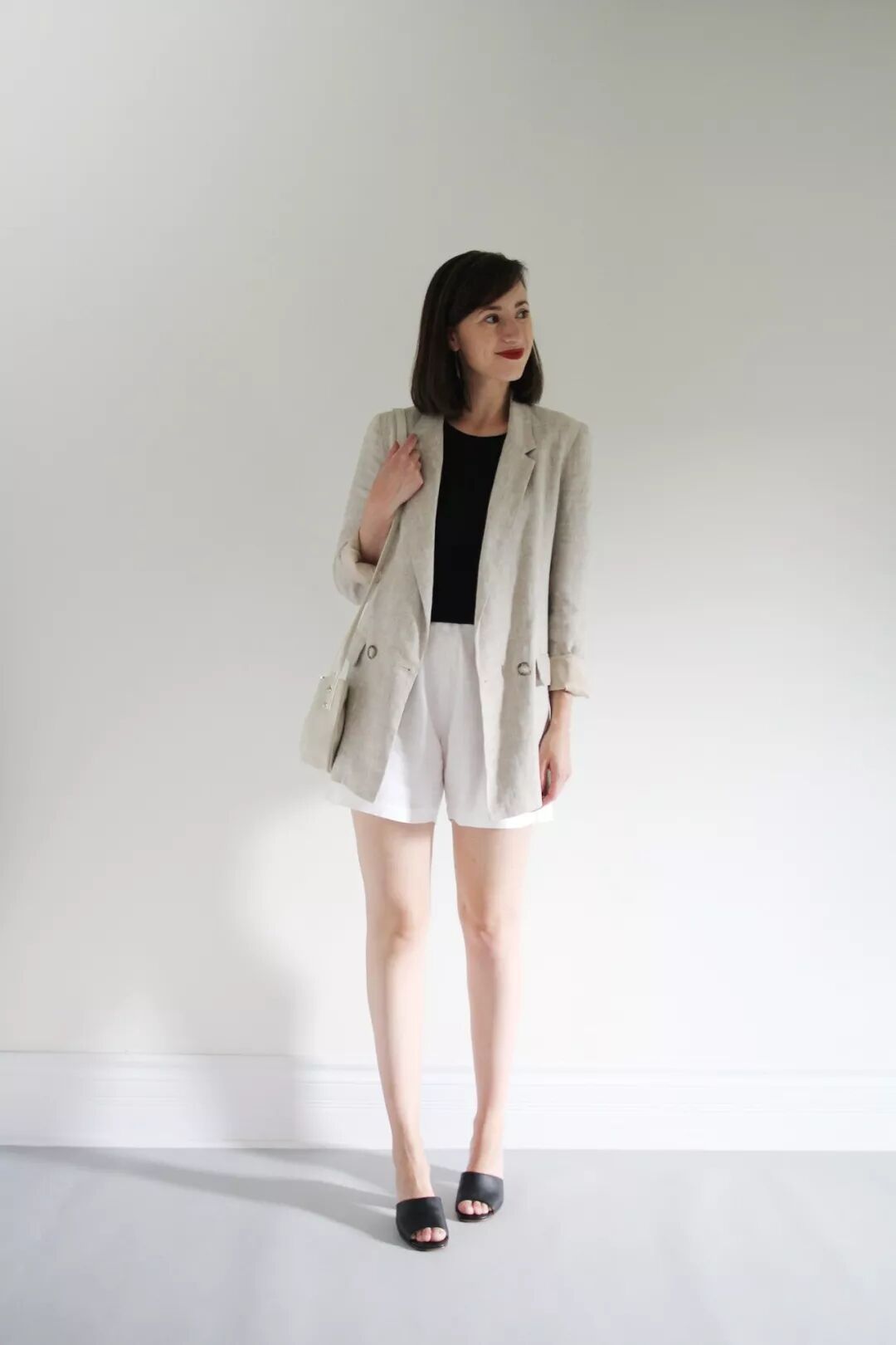 博主 Lee 的示範,她的風格一向是極簡風,所以挑的短褲是偏西裝短褲一些的樣式,外套則是薄牛仔外套、小西裝、和風外套,都是純色簡潔的款式:
