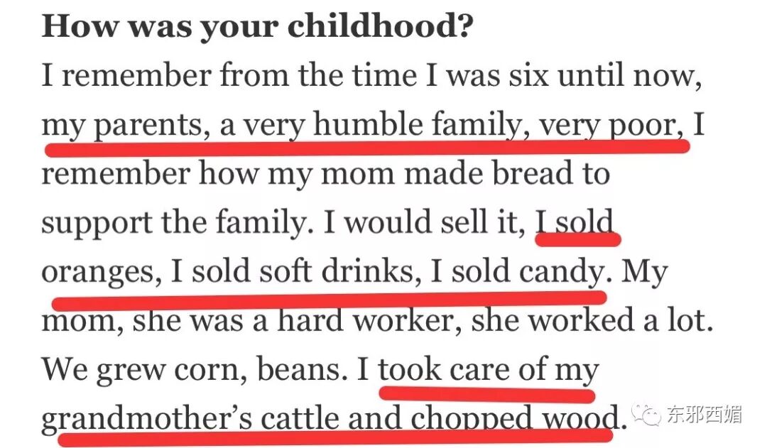 他曾親口說過,小時候家里一窮二白。從小他每天就要幹很多活:劈柴、放牛、種莊稼、上街賣媽媽做的麵包,還有桔子、飲料、糖果等等。