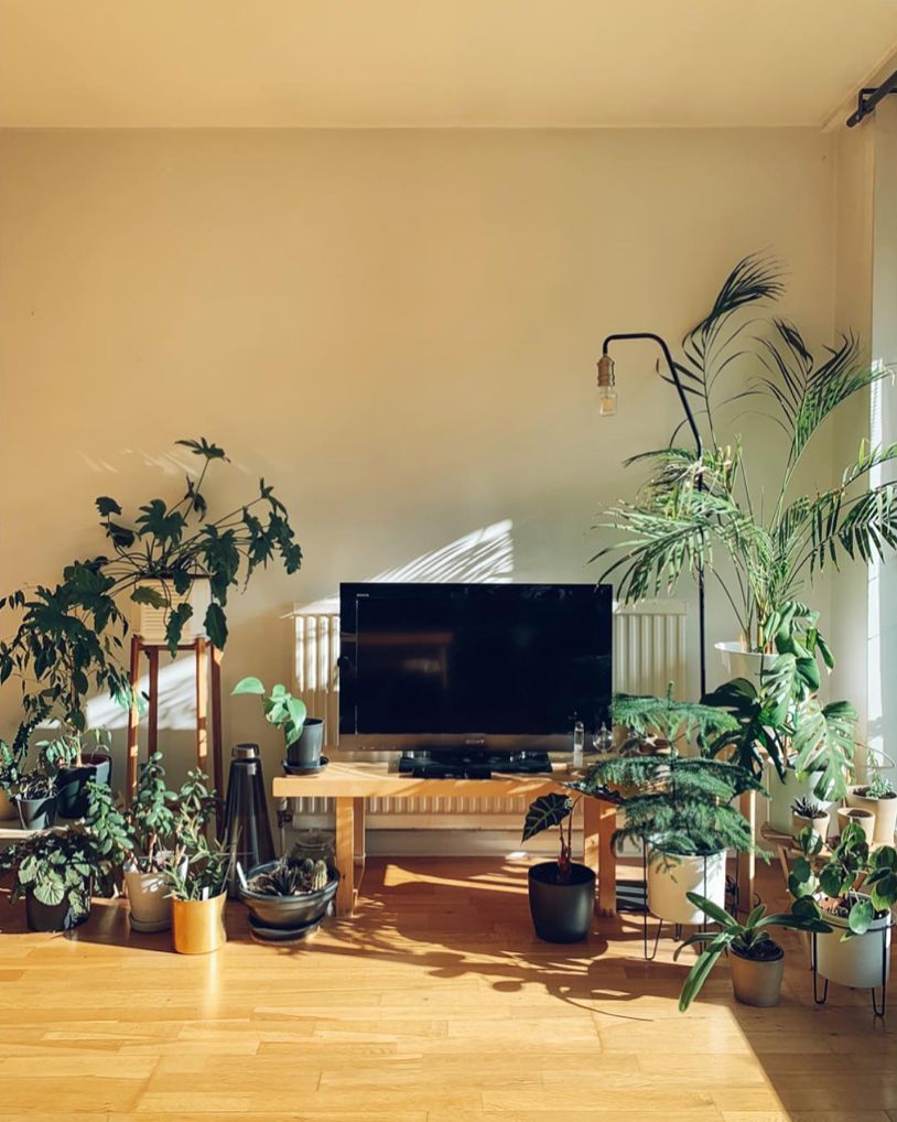 A:大概有超過 130 株植物。最偏愛的,就是我們第一次帶回家的植物。它當時還是一株小小的傘狀植物(鴨掌木),現在它已有兩米高,觸到了天花板。我們大概會因此搬家,或者買一套頂層公寓並在屋頂上為它挖個洞……