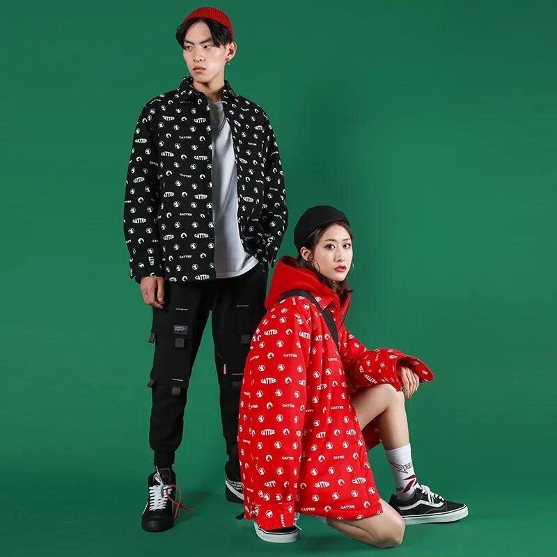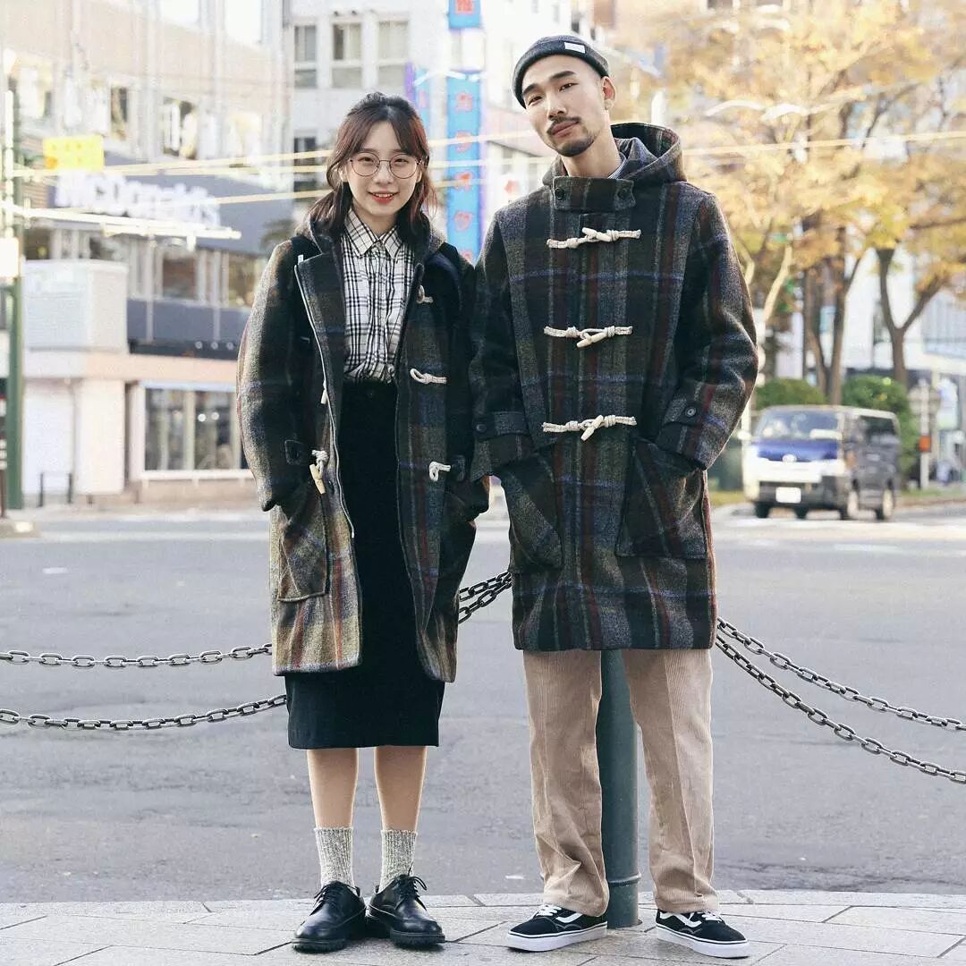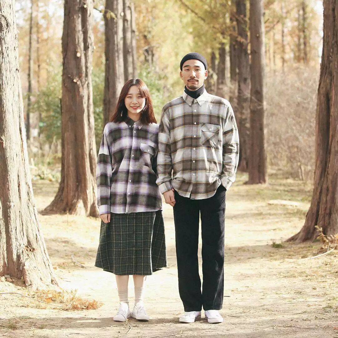 男生的上衣和女生耳朵裙子都有格紋元素。