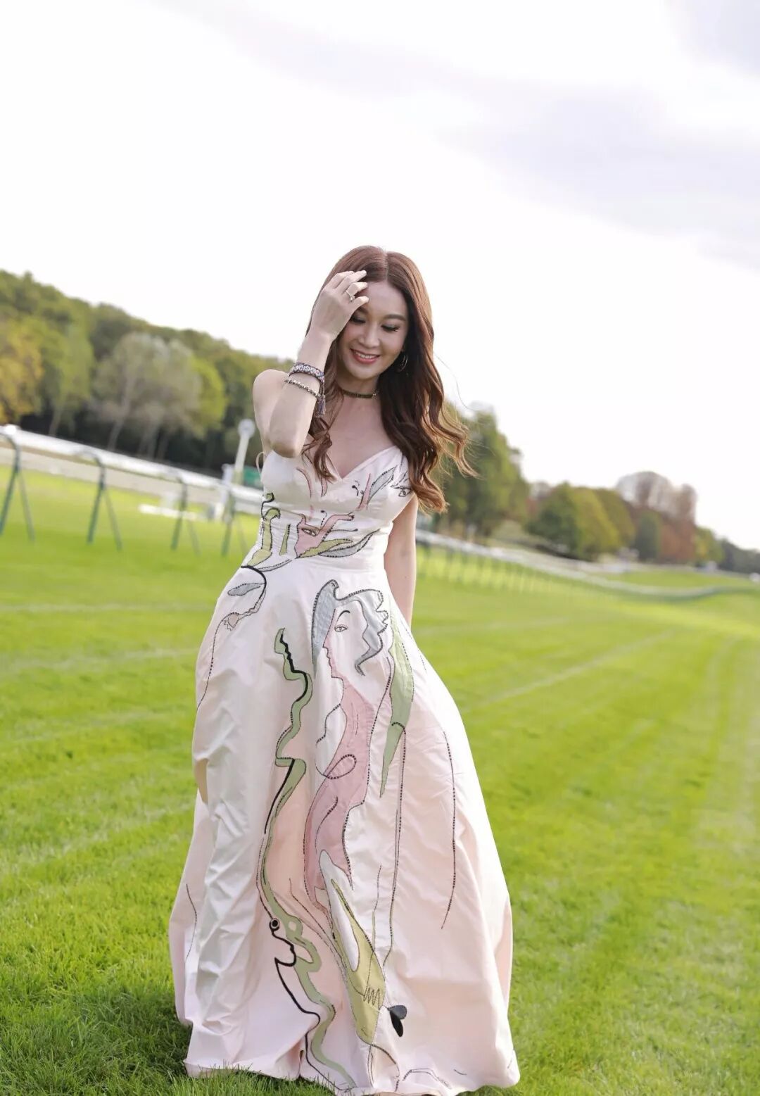 發現她的裙子都會露胸,你看她這一身又是吊帶設計的裙子,把她的胸部都顯現出來了,不過這條裙子的設計還是很好的,主打色是粉色,上面會有一些彩繪,很有藝術感覺。