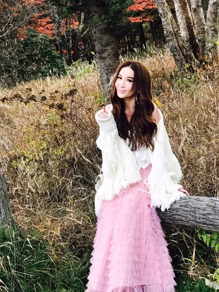 她的這身打扮是真的夠少女,她上面穿了一件抹胸的白色衣服打底,外面罩了一件針織衫,而且還是流蘇設計的,下面一條粉色重疊式的裙子,看起來特別的閒嫩。